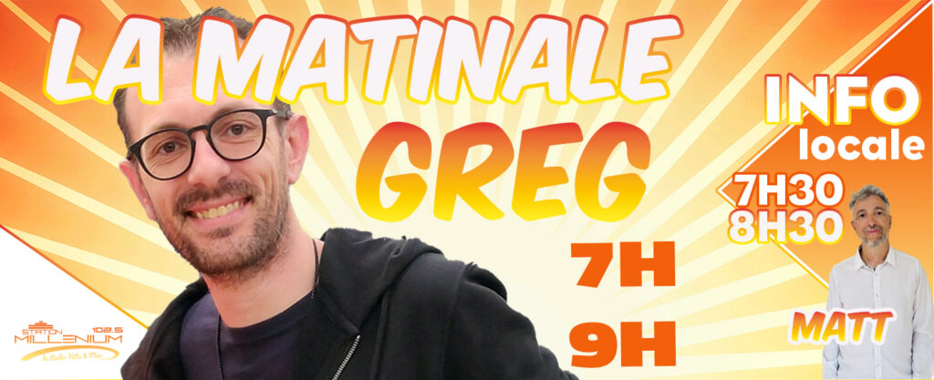 pour bien débuter la journée en compagnie de Greg, tous les jours de la semaine à partir de 7h00. Et à 7h30 et à 8h30 retrouvez toute votre info locale avec Matt.
